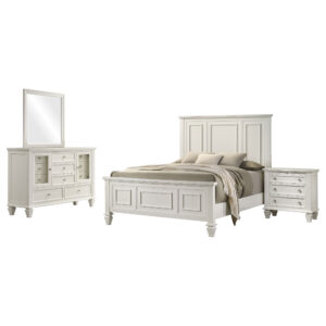 $1,693.00The Kauffman four-piece bedroom set features a chic transitional design with natural oak grain, a greyish brown patina, and elegant silvery hardware. -