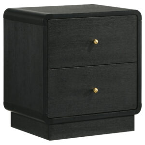 $320.00Enhance your bedroom with the Cavelle two-drawer nightstand, featuring a rich black finish, brass knobs, and smooth metal glides for stylish storage. -
