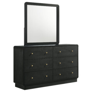 $794.00Enhance bedroom storage with the Cavelle dresser and mirror. Six spacious drawers with brass knobs and a sleek black finish offer style and organization. -