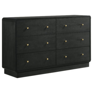 $681.00Enhance your bedroom with the Cavelle six-drawer dresser, featuring a sleek black finish, brass knobs, rounded corners, and ample storage for decor. -