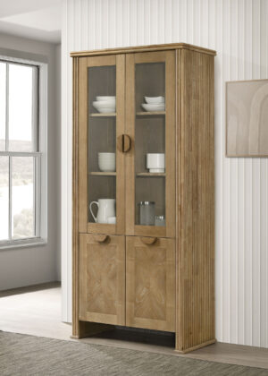 $1,241.00Elevate your dining room with the Adina tall sideboard in distressed light brown, featuring glass doors, adjustable shelves, and durable oak veneer for stylish storage. -