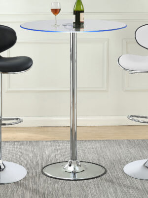 $354.00The Thea bar table features a sleek chrome pedestal, clear tempered glass top, and LED lights, perfect for a modern breakfast nook or lounge. -