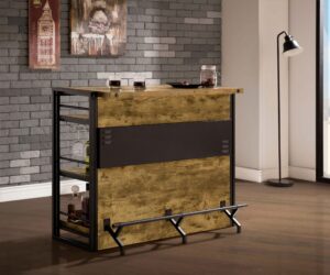 $652.00Serve smiles at your gathering with the Joe wooden bar unit. Its rustic design, roomy shelves, and metal footrest ensure comfort and style for years. -