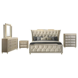 $2,496.00The Lorient bedroom set glows with LED-lit velvet, crystal accents, and sculpted charm, anchored by a dresser crowned in tempered glass elegance. -