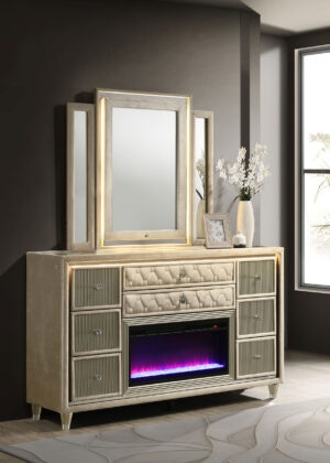 $1,384.00The Lorient flame box dresser and mirror set includes LED lighting, velvet upholstery, a flame visualizer with remote, and a clear glass top. -