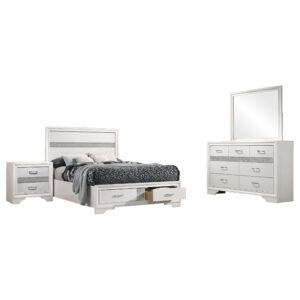 $1,309.00Elevate your bedroom with the Miranda four-piece set, featuring a chic bed, nightstand, dresser, and mirror, all with glamorous details and a cool white finish. -