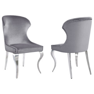 $707.00Elevate your dining with the Cheyanne demi wing chair. Polished stainless steel legs, hand-driven nailhead trim, and soft velvet offer luxury and comfort. -