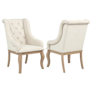 $834.00The Brockway dining armchair features gracefully swooping arms, diamond tufting, cream upholstery with nailhead trim, and durable rubberwoods. -