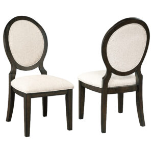 $504.00The Twyla side chair features elegant curves, cream linen upholstery, and a dark cocoa finish, perfect for comfortable dining with timeless style. -